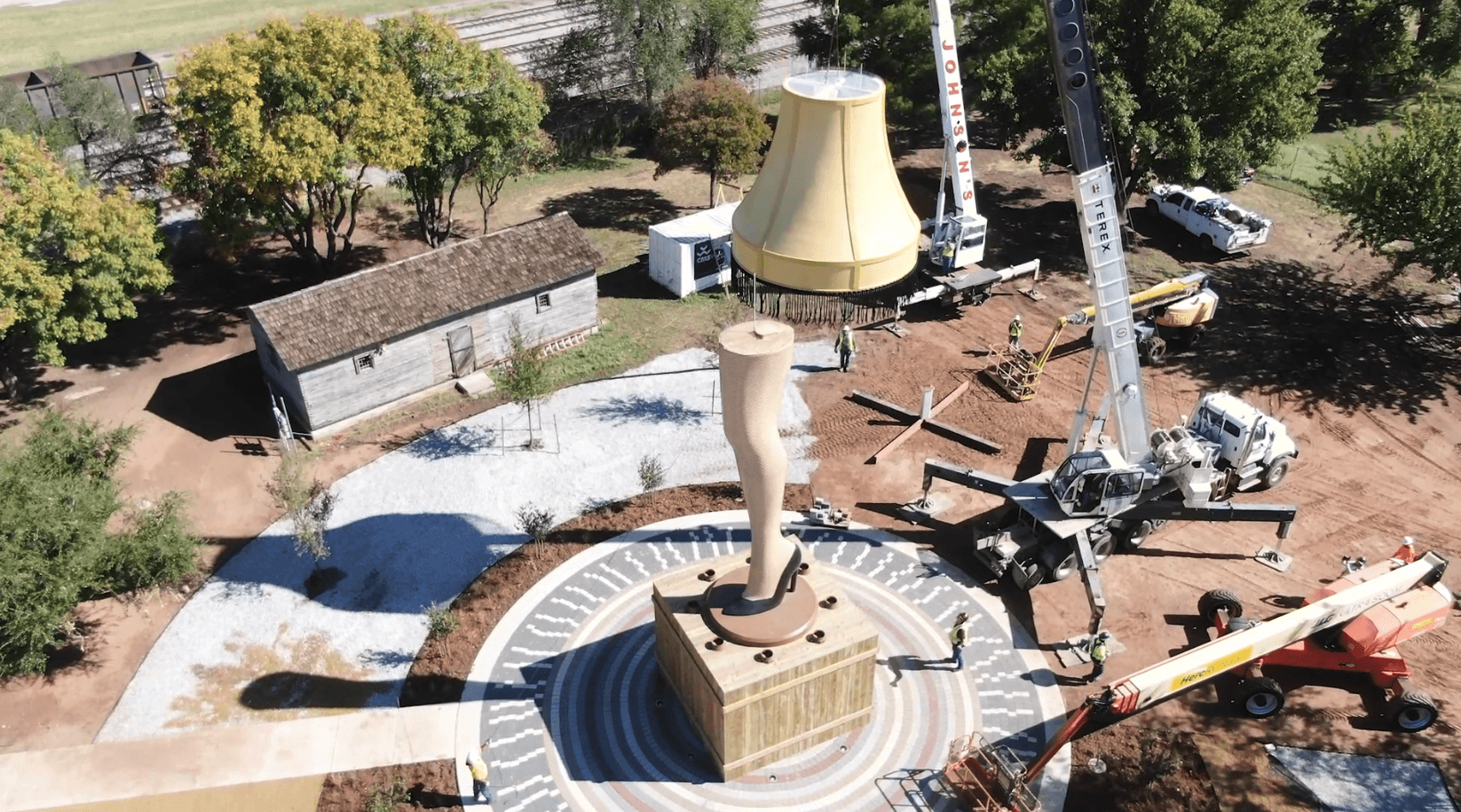 Tim Elliot and several other true believers in Chickasha continued their march forward, determined to bring the massive leg lamp to fruition. A first iteration of the project was a giant inflatable leg lamp which led to weather issues (blown over in high winds, drooped and saggy during the heat) plus a need for constant repairs. The leg lamp was even stabbed at one point. A local firm was thus contracted to make a permanent fibreglass version that took two forty-foot cranes to lift into place.