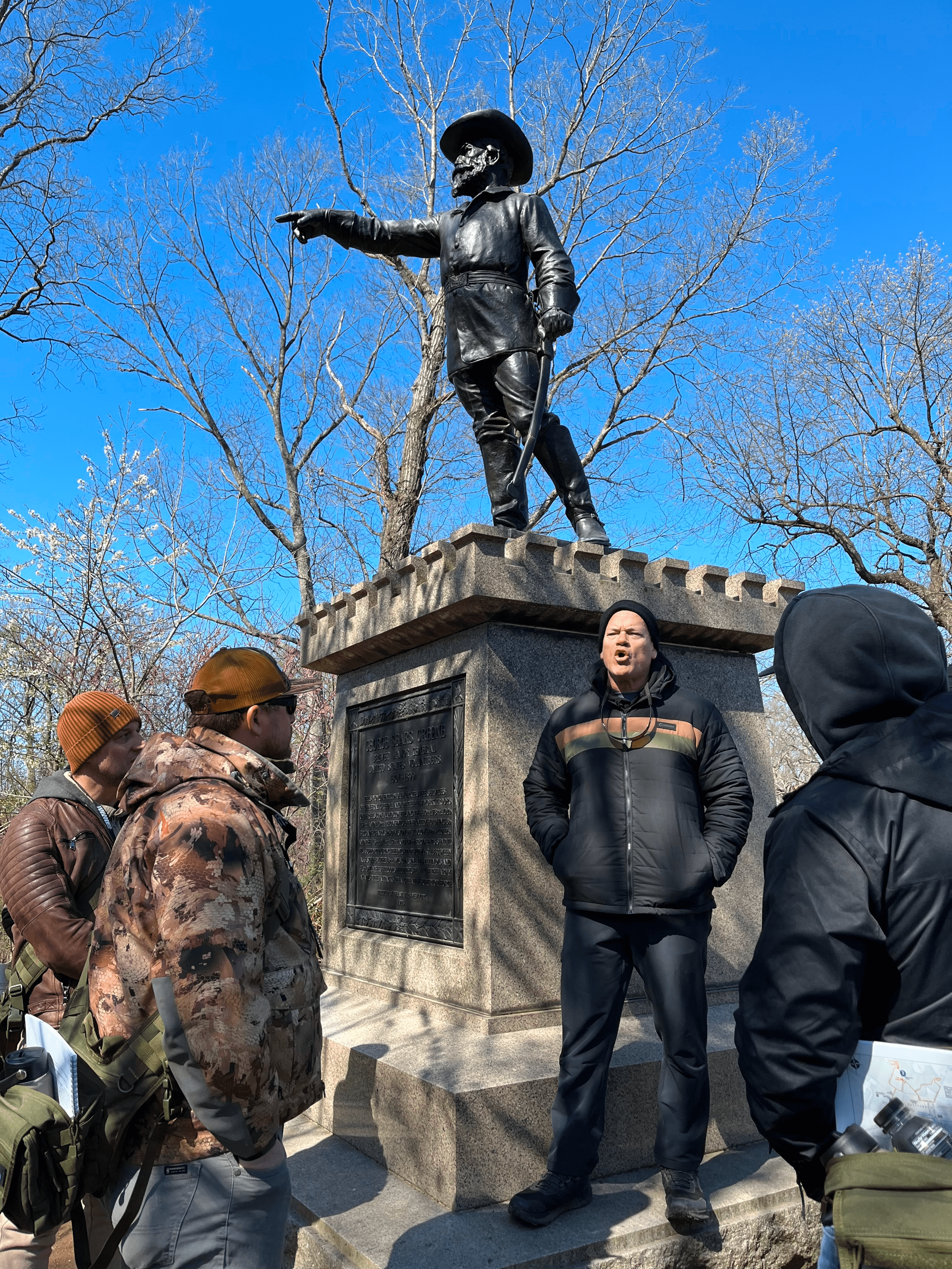 There would be four sections to each stop on the battlefield. The first bit would be led by Colonel Rob Abbott, a retired Marine and licensed Gettysburg tour guide. He’d explain what had happened in the battle up until that point and the overall strategic context. Abbott has a wry sense of humor and would salt his narrative with colorful anecdotes. The second section, led by J.D. Baker, would relate in greater detail the leaders, their personalities, and the key decision they faced in that moment. Baker is also a retired Marine and the former director of the Marines’ scout-sniper program. He is a real cut up who turns it up to eleven in his animated delivery and comedic role playing. The next section would open up into a group discussion, both about how leadership could have made better decisions in this moment, and how we might apply the same principle in our own work. During the last section of a stop, Willink, the guides, and the other SEALs would offer their insights and takeaways in a roundup.
