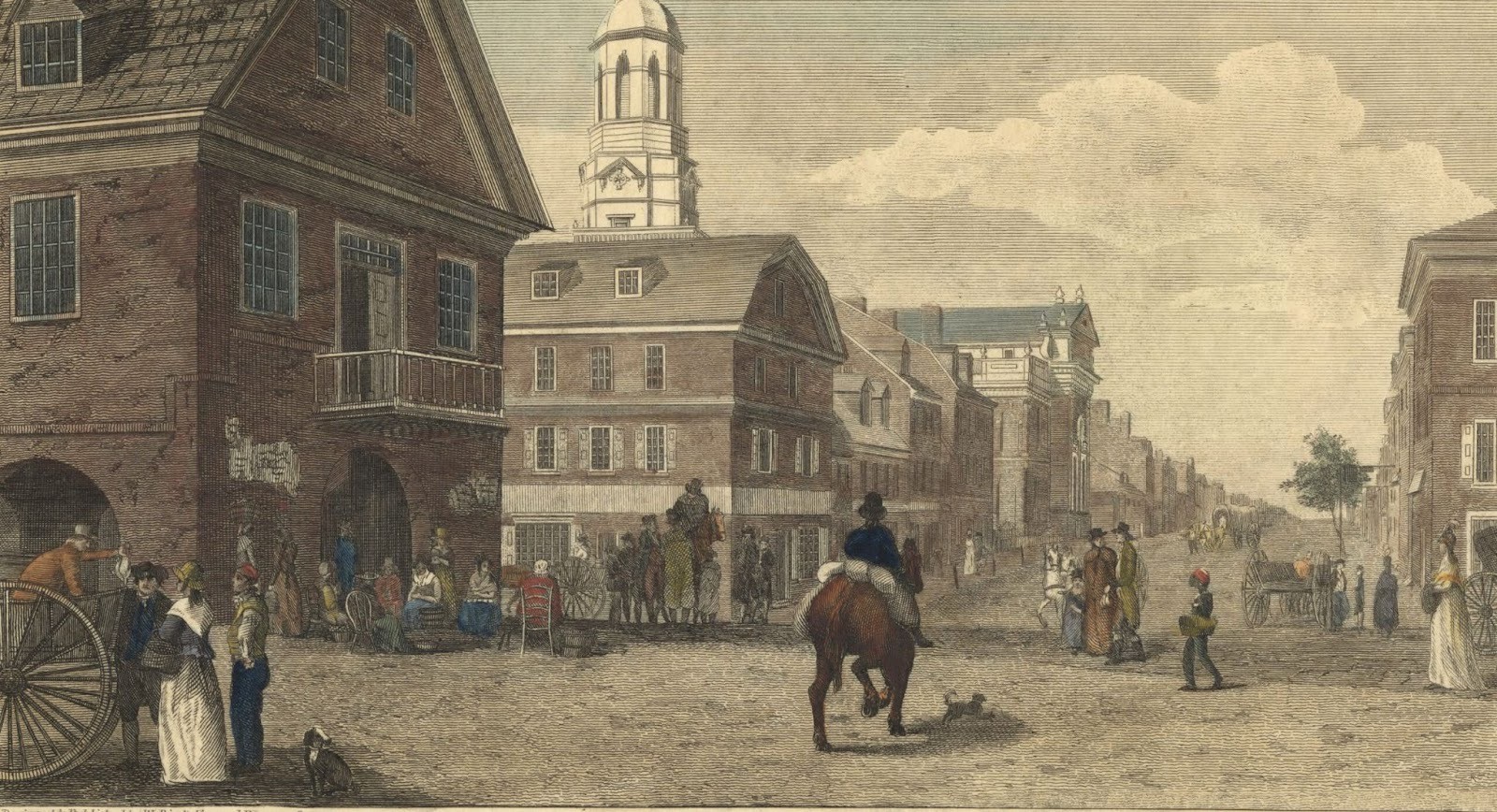 Engraving of Philadelphia from 1799. Second Street North from Market St. and Christ Church, created by William Birch